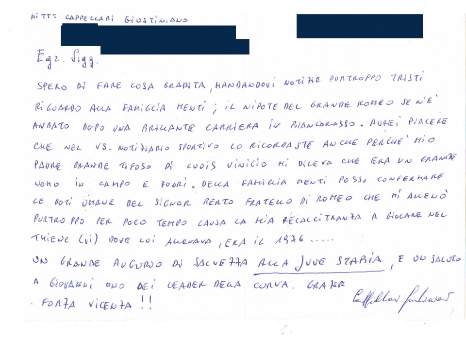 S.S. Juve Stabia ringrazia il signor Cappellari per la sensibilità e la gentilezza dimostrate ed esprime le sue più sentite condoglianze alla famiglia Menti, alla quale il calcio stabiese è indissolubilmente legato da quando, nel lontano 1944, Romeo Menti giunse a Castellammare e in un’Italia ancora alle prese con il secondo conflitto mondiale, riuscì nell’impresa di condurre i suoi compagni di squadra alla vittoria del Campionato Regionale Campano e della Coppa del Coni.
