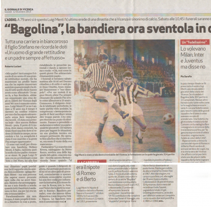Di seguito la lettera inviata dal sig. Cappellari e l'articolo scritto per la scomparsa di Luigi Menti IV da Roberto Luciani su "Il Giornale di Vicenza" del 12 dicembre 2013
