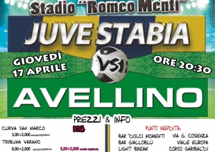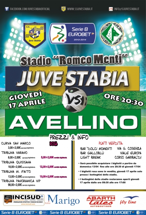 S.S. Juve Stabia rende noto che sono disponibili in prevendita, fino alle ore 20,30 del 17 aprile, i tagliandi di ingresso per assistere alla gara Juve Stabia-Avellino, incontro valido per la 35° giornata della Serie B Eurobet 2013/2014, che si disputerà giovedì 17 aprile alle ore 20,30 allo Stadio "Romeo Menti".