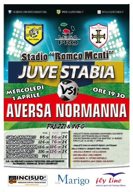 S.S. Juve Stabia rende noto che sono disponibili in prevendita, fino alle ore 19,30 di mercoledì 1 aprile, i tagliandi di ingresso per assistere alla gara Juve Stabia-Aversa Normanna, che si disputerà mercoledì 1 aprile alle ore 19,30 allo Stadio “Romeo Menti”, valevole per la 33a giornata del Girone C della Lega Pro Divisione Unica 2014/2015.