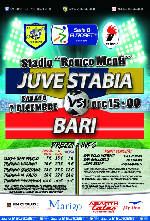 Pertanto a partire da domani, martedì 3 dicembre, sono disponibili in prevendita, fino alle ore 15,00 del 7 dicembre, i tagliandi di ingresso per assistere alla gara Juve Stabia-Bari di sabato 7 dicembre alle ore 15,00 allo Stadio Romeo Menti, valevole per la 17° giornata del Campionato Serie B Eurobet 2013/2014.Di seguito i prezzi relativi ad ogni singolo settore: