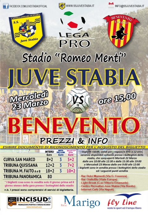 S.S. Juve Stabia rende noto inoltre che sono disponibili in prevendita anche i BIGLIETTI ROSA e i RIDOTTI (per bambini fino a 12 anni) per assistere alla gara Juve Stabia-Benevento.