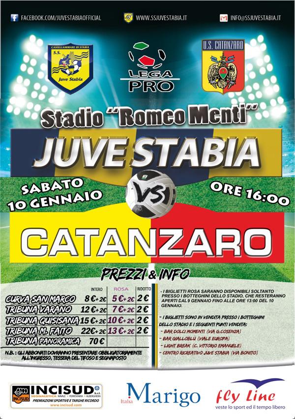 S.S. Juve Stabia rende noto che sono disponibili in prevendita, fino alle ore 16,00 di sabato 10 gennaio, i tagliandi di ingresso per assistere alla gara Juve Stabia-Catanzaro, che si disputerà sabato 10 gennaio alle ore 16,00 allo Stadio “Romeo Menti”, valevole per la 20a giornata del Girone C della Lega Pro Divisione Unica 2014/2015.