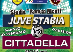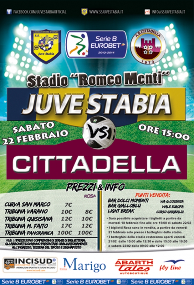 S.S. Juve Stabia S.p.A. rende noto che da oggi, martedì 18 febbraio, sono disponibili in prevendita, fino alle ore 15,00 del 22 febbraio, i tagliandi di ingresso per assistere alla gara Juve Stabia-Cittadella, incontro valido per la 26° giornata della Serie B Eurobet 2013/2014, che si disputerà sabato 22 febbraio alle ore 15,00 allo Stadio "Romeo Menti".