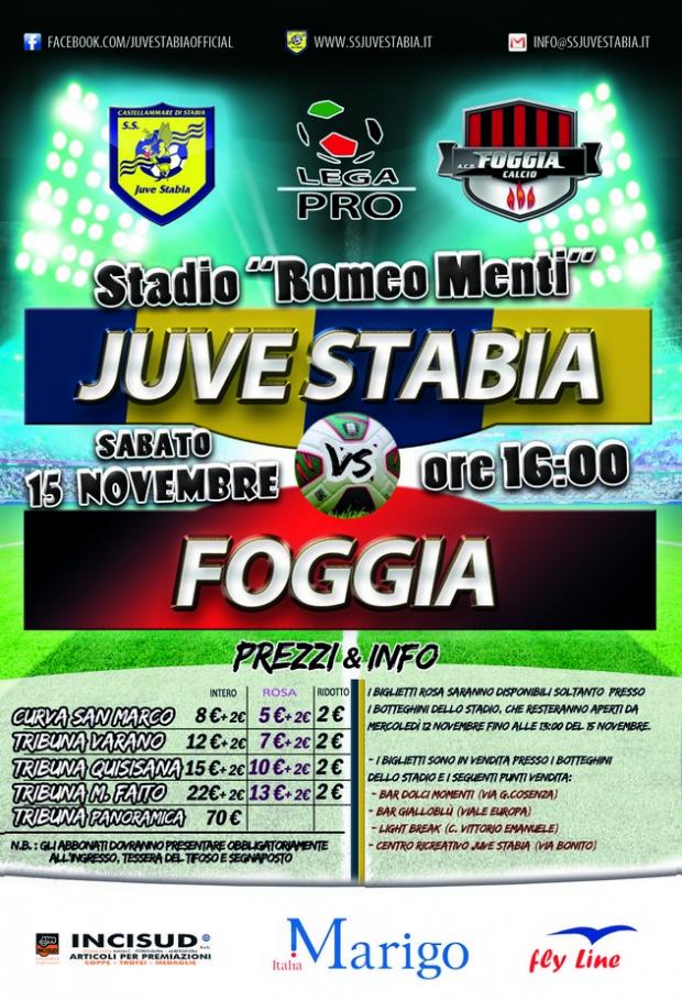 S.S. Juve Stabia rende noto che sono disponibili in prevendita, fino alle ore 16,00 del 15 novembre, i tagliandi di ingresso per assistere alla gara Juve Stabia-Foggia, che si disputerà sabato 15 novembre alle ore 16,00 allo Stadio “Romeo Menti”, valevole per la 13a giornata del Girone C della Lega Pro Divisione Unica 2014/2015.