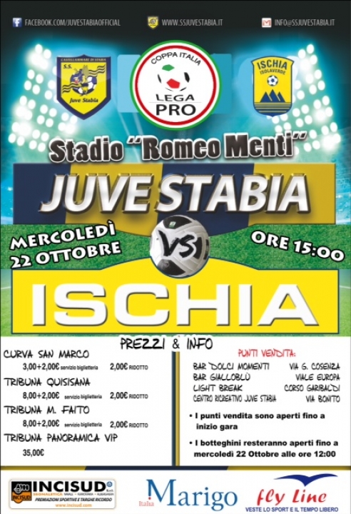 S.S. Juve Stabia rende noto che sono disponibili in prevendita, fino alle ore 15,00 del 22 ottobre, i tagliandi di ingresso per assistere alla gara Juve Stabia-Ischia Isolaverde, che si disputerà mercoledì 22 ottobre alle ore 15,00 allo Stadio “Romeo Menti”, valevole per il secondo turno della Coppa Italia Lega Pro 2014/2015.