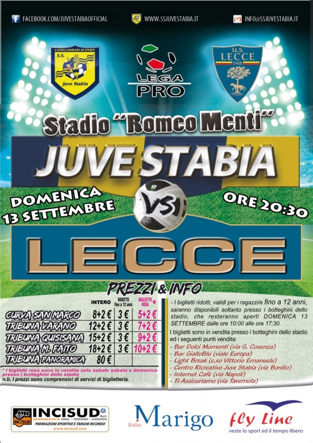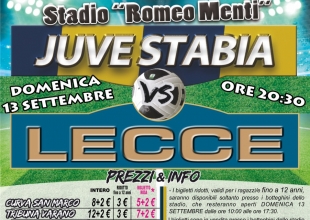 S.S. Juve Stabia rende noto che sono disponibili in prevendita, fino alle ore 20,30 del 13 settembre, i tagliandi di ingresso per assistere alla gara Juve Stabia-Lecce, che si disputerà domenica 13 settembre alle ore 20,30 allo Stadio “Romeo Menti”, valevole per la 2a giornata del Girone C della Lega Pro Divisione Unica 2015/2016.