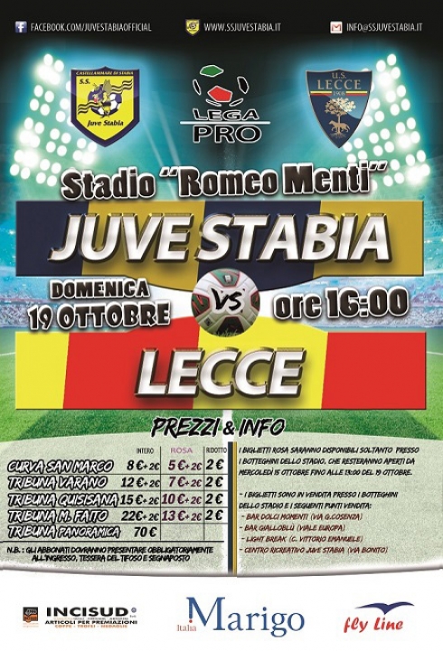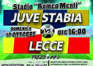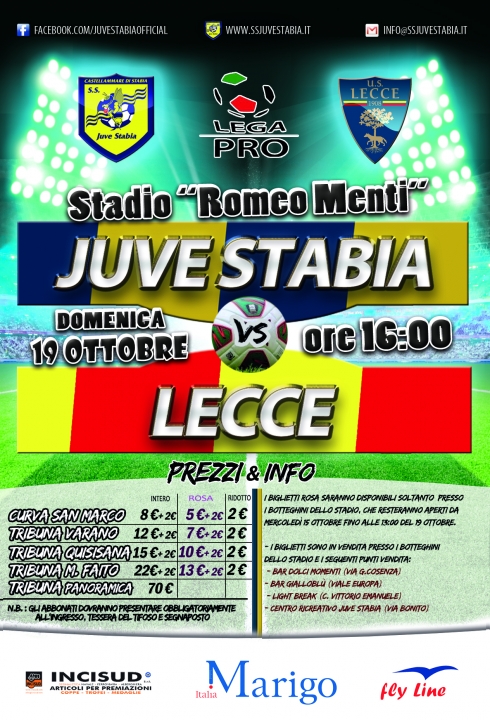 S.S. Juve Stabia rende noto che sono disponibili in prevendita, fino alle ore 16,00 del 19 ottobre, i tagliandi di ingresso per assistere alla gara Juve Stabia-Lecce, che si disputerà domenica 19 ottobre alle ore 16,00 allo Stadio “Romeo Menti”, valevole per la 9a giornata del Girone C della Lega Pro Divisione Unica 2014/2015.