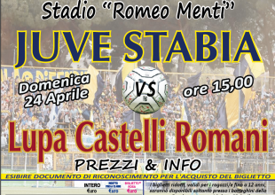 S.S. Juve Stabia rende noto che da domani, giovedì 21 aprile, sono disponibili in prevendita, fino alle ore 11,30 del 24 aprile, i tagliandi di ingresso per assistere alla gara Juve Stabia-Lupa Castelli Romani, che si disputerà domenica 24 aprile alle ore 15,00 presso lo Stadio “Romeo Menti” di Castellammare di Stabia, valevole per la 32a giornata del Girone C della Lega Pro Divisione Unica 2015/2016. In occasione di questa gara, resterà chiusa la Tribuna Varano (distinti)