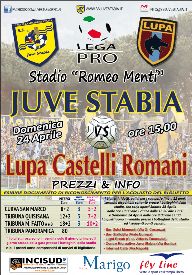 S.S. Juve Stabia rende noto inoltre che sono disponibili in prevendita anche i BIGLIETTI ROSA e i RIDOTTI (per bambini fino a 12 anni) per assistere alla gara Juve Stabia-Lupa Castelli Romani.