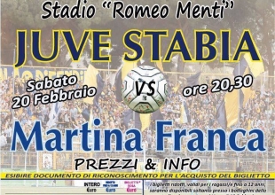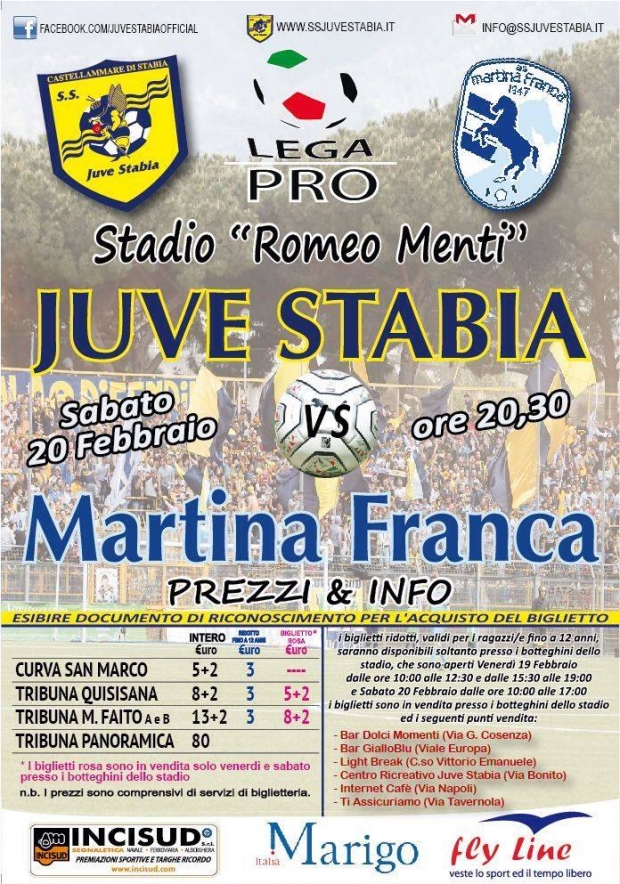 Inoltre, S.S. Juve Stabia rende noto che, da mercoledì 17 febbraio, saranno disponibili in prevendita, fino alle ore 20,30 del 20 febbraio, i tagliandi di ingresso per assistere alla gara Juve Stabia-Martina Franca, che si disputerà sabato 20 febbraio alle ore 20,30 allo Stadio “Romeo Menti”, valevole per la 23a giornata del Girone C della Lega Pro Divisione Unica 2015/2016.