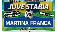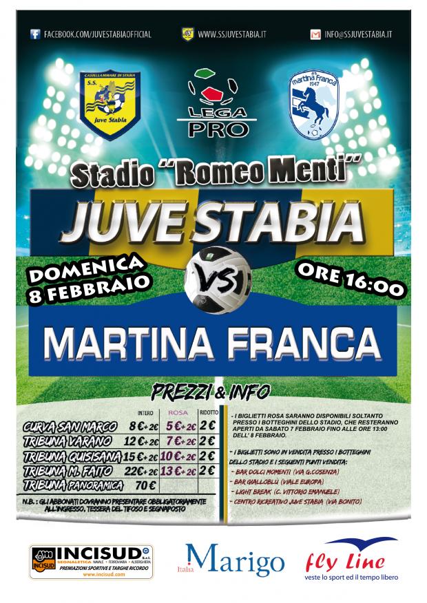 S.S. Juve Stabia rende noto che sono disponibili in prevendita, fino alle ore 16,00 di domenica 8 febbraio, i tagliandi di ingresso per assistere alla gara Juve Stabia-Martina Franca, che si disputerà domenica 8 febbraio alle ore 16,00 allo Stadio “Romeo Menti”, valevole per la 24a giornata del Girone C della Lega Pro Divisione Unica 2014/2015.