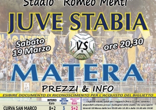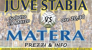 S.S. Juve Stabia rende noto che da oggi, mercoledì 16 marzo, sono disponibili in prevendita, fino alle ore 20,30 del 19 marzo, i tagliandi di ingresso per assistere alla gara Juve Stabia-Matera, che si disputerà sabato 19 marzo alle ore 20,30 presso lo Stadio “Romeo Menti” di Castellammare di Stabia, valevole per la 27a giornata del Girone C della Lega Pro Divisione Unica 2015/2016.