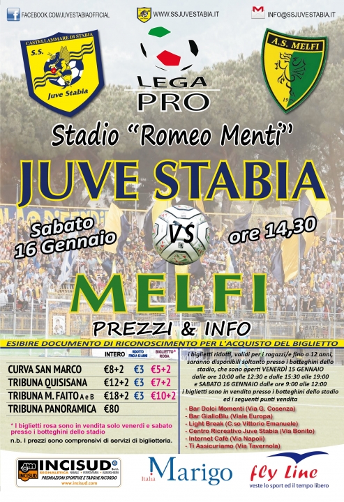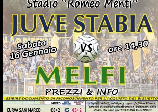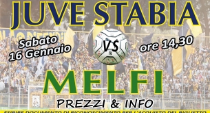 S.S. Juve Stabia rende noto che, da mercoledì 13 gennaio, saranno disponibili in prevendita, fino alle ore 14,30 del 16 gennaio, i tagliandi di ingresso per assistere alla gara Juve Stabia-Melfi, che si disputerà sabato 16 gennaio alle ore 14,30 allo Stadio “Romeo Menti”, valevole per la 18a giornata del Girone C della Lega Pro Divisione Unica 2015/2016.