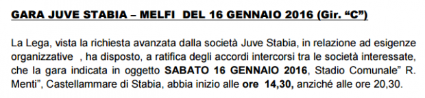 Juve Stabia-Melfi, variazione orario