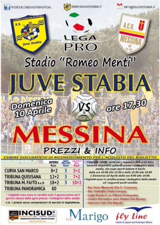 S.S. Juve Stabia rende noto che da oggi, mercoledì 6 aprile, sono disponibili in prevendita, fino alle ore 17,30 del 10 aprile, i tagliandi di ingresso per assistere alla gara Juve Stabia-Messina, che si disputerà domenica 10 aprile alle ore 17,30 presso lo Stadio “Romeo Menti” di Castellammare di Stabia, valevole per la 30a giornata del Girone C della Lega Pro Divisione Unica 2015/2016.