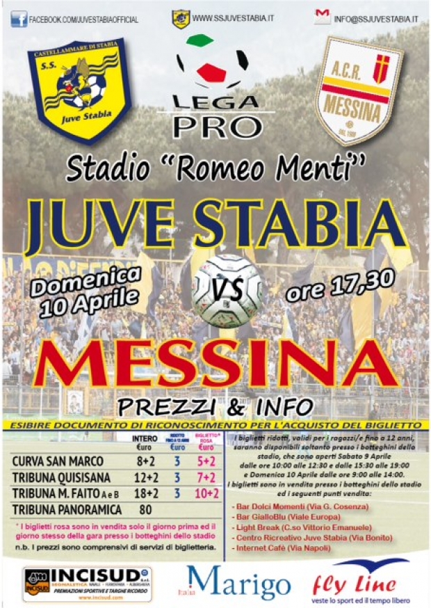 S.S. Juve Stabia rende noto inoltre che sono disponibili in prevendita anche i BIGLIETTI ROSA e i RIDOTTI (per bambini fino a 12 anni) per assistere alla gara Juve Stabia-Messina.