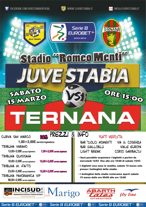 S.S. Juve Stabia S.p.A. rende noto che da oggi, mercoledì 12 marzo, sono disponibili in prevendita, fino alle ore 15,00 del 15 marzo, i tagliandi di ingresso per assistere alla gara Juve Stabia-Ternana, incontro valido per la 29° giornata della Serie B Eurobet 2013/2014, che si disputerà sabato 15 marzo alle ore 15,00 allo Stadio "Romeo Menti".