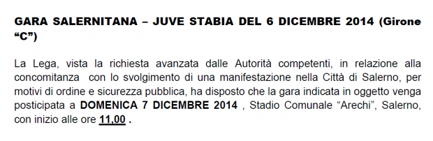 Salernitana-Juve Stabia posticipata a domenica 7 dicembre